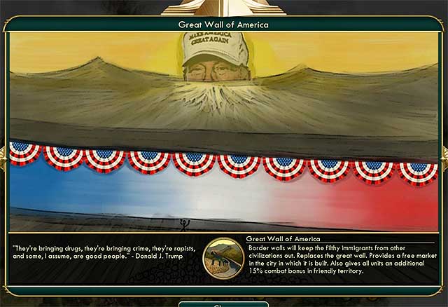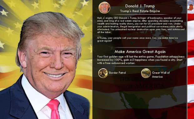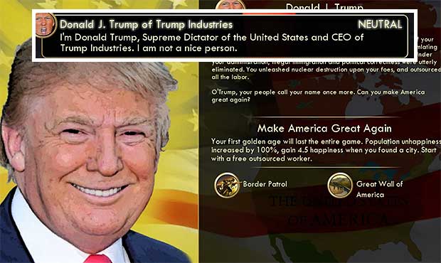 With Trump’s campaign in such good shape, now’s a good a time to look at “Donald Trump’s America” mod (modification) of the game Civilization V that was released late last year. The alteration turns Trump into one of the game’s “immortal leaders” allowing Trump to reign for all of history, with the tradeoff being that the unhappiness level of the population reaches 100%.