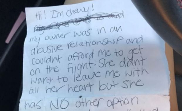 The note read, “Hi, I’m Chewy! My owner was in an abusive relationship and couldn’t afford me to get on the flight. She didn’t want to leave me with all her heart but she has. NO other option. My boyfriend kicked my dog when we were fighting and he has a Big knot on his head. He probably needs a vet. I love Chewy sooooo much please love and take care of him. Xoxoxoxo.”