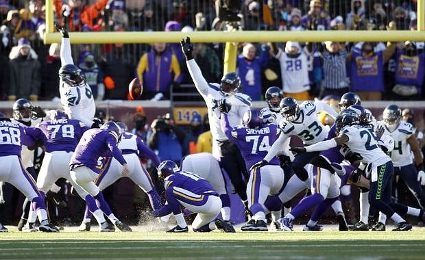 Trailing 10-9 with two minutes to go, the Vikings marched down the field and with less than 30 seconds to go, set up kicker Blair Walsh for a 27-yard field goal that would have given them the lead. Instead, Walsh pulled the kick left.