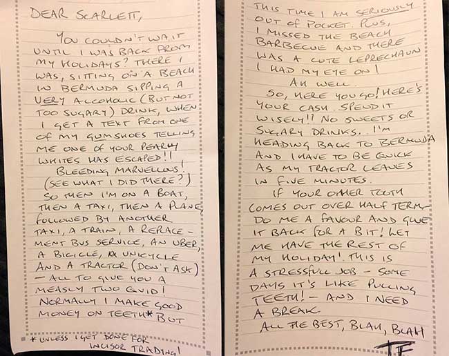Scarlett’s stepfather, Adrian, filled the letter with puns and gave us a little insight into the tooth fairy’s world. Check out the letter below.