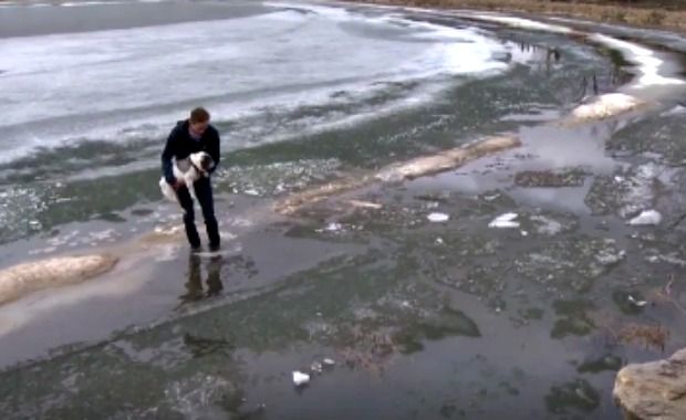 In the dramatic video you can see MacIver jump in and swim his way over to Cosmo who is feverishly doggy paddling to keep his head above the water. For one breath-holding second the two plunge down together, only to resurface as MacIver pushes Cosmo onto steady ice. When you think they are out of harms way, MacIver, with Cosmo in his arms, steps cautiously toward the bank over more thin ice when they plunge down again. Finally they make it onto stable ground.