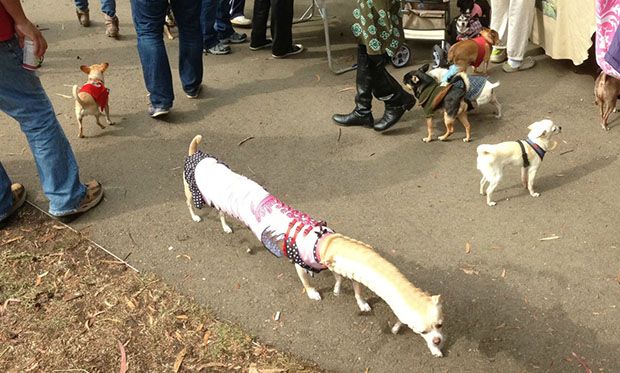 I typed “synonyms for disturbing” into Google and the following words to describe this image appeared: disquieting, creepy, distressing, troubling, worrisome. First of all, the distorted chihuahua pictured brings vivid memories of the horror movie Human Centipede to mind. Also — why are all of these clothed chihuahuas congregated here? What are they planning?