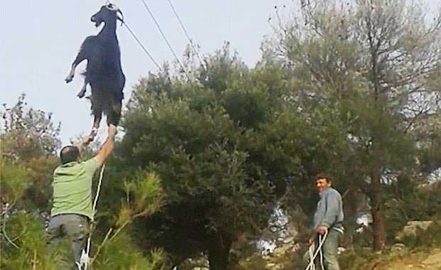 A live goat was found hanging by its horns from telephone wires about 20 feet above a Greek road. I promise, this is not the beginning to a joke.