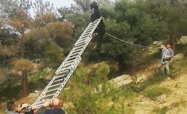 The brave and befuddled men eventually pushed the goat toward a steep rock face using their ladder. One of the rescuers climbed up the hill, close enough to tie a rope around the goat’s leg.