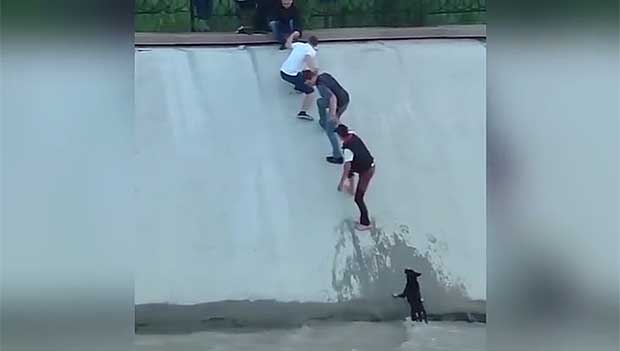 A one minute clip posted by ViralHog shows a group of people forming a human chain to scale down a wall and rescue a trapped dog from a swollen river bed.