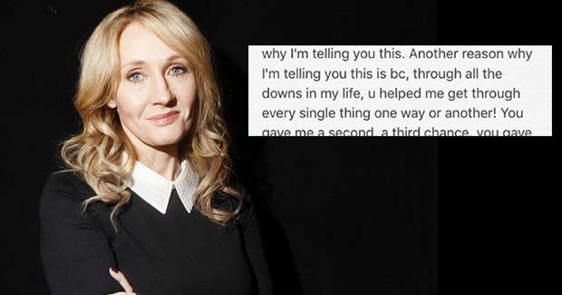 “This won’t take long, I promise… I’ve been through (and am still going through) so many things in my life, from sexual assault to bullying to attempted suicide 8 times. I’m not proud of these things, but it’s who I am. I’m also trying my hardest to stop self-harming. It hurts my body, but it hurts my soul more. I know you won’t judge, that’s why I’m telling you this. Another reason why I’m telling you this is because, through all the downs in my life, you helped me get through every single thing one way or another! You gave me a second, a third chance, you gave me so many chances in life and not taking them seriously wouldn’t be fair to you. I will never be able to thank you enough, Jo. I wanna get “expecto patronum” tattooed on the wrist I usually cut the most, or somewhere else idk yet exactly, because I know that’s gonna make me stop even if it takes a while. Please, Jo. I know I can slowly start to recover, but I need your help to do so. You’ve always been there and I know you’ll always be. – Kate.”