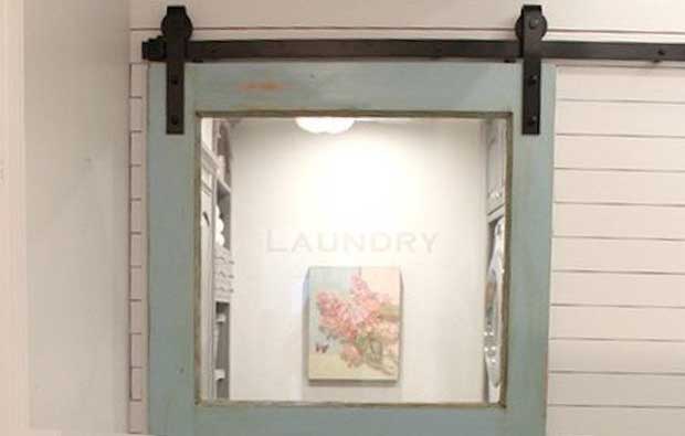 The mother of six’s DIY innovations include stacking machines for extra space, installing large sorting bins for the individual family members to self-sort their own laundry, six portable baskets for clean clothes to be stored in and transported after washing, pull-out drying racks – made from dollar store materials – used to store and dry hand-wash only items, a finished faux marble countertop that can easily be removed for space, a hanger bar, a cabinet with a fold out ironing board. The allure of the room is topped off by an ornate sliding barn-door style entrance.