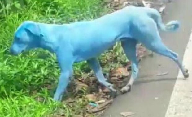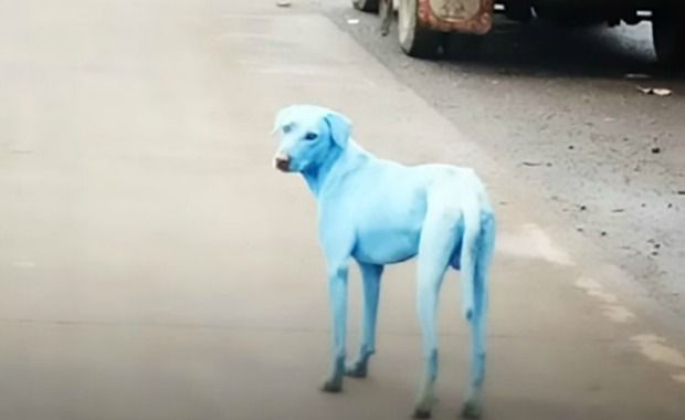 A light blue stray dog is seen crossing the road in Mumbai. This is not the beginning of a joke but of a very serious problem that has animal rights activists and environmentalists furious in India. Several videos have emerged on social media of five stray dogs meandering the streets as they often do; except some of the dogs had fur that was tinged baby blue.