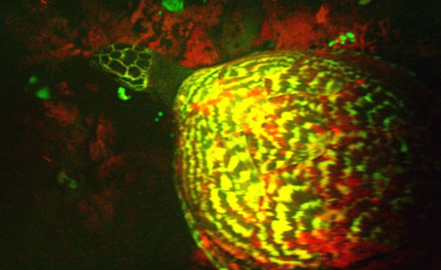 In the video, the hawksbill sea turtle is “glowing” neon green and red.
