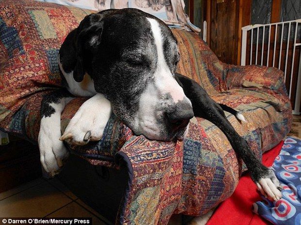 The giant Great Dane weighs about 200 pounds and is about 6 feet long, measuring from his nose to his tail.