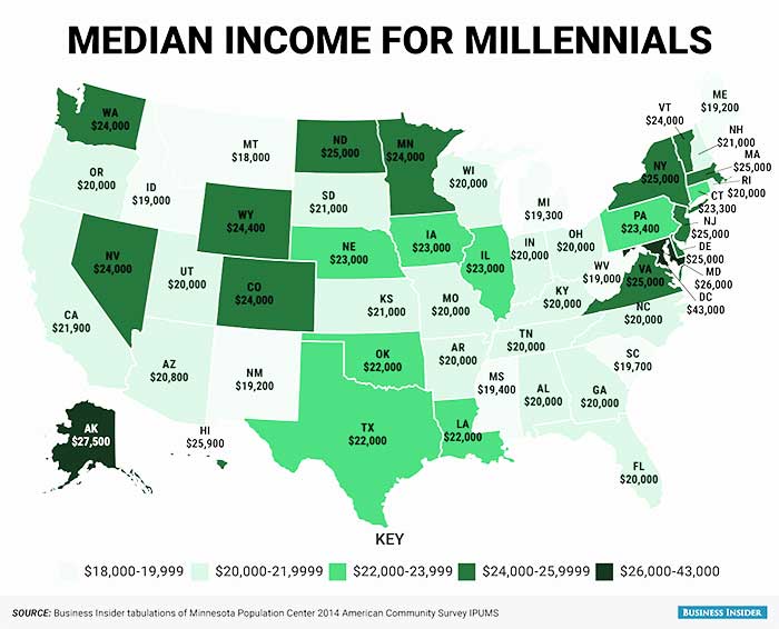 A recent study done by Business Insider revealed the median income for millennials varies depending on the state they live in. The income ranged anywhere from $18,000 in Montana to $43,000 in Washington, D.C.