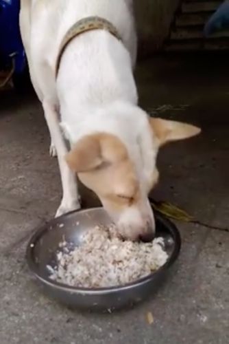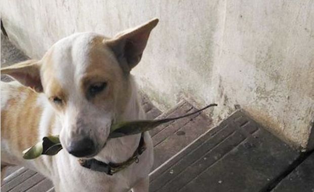 “When he’s hungry, he will offer something to get fed,” Thailand-based Orawan Kaewla-iat wrote on Facebook. “Every day he shows up with an object in his mouth — usually a leaf and sometimes a piece of paper. Before you feed other dogs, you have to feed Tua Plu and his mom.”